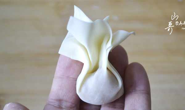 6.下面我們包餛飩,餛飩的包法有很多,今天給大傢介紹一個特別簡單的。取一張餛飩皮,然後放上一團餡料,隻需要捏起收口即可,方法特別簡單