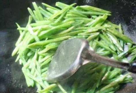 步驟三:起鍋熱油,油熟後放入蒜末煸炒出香味,然後倒入扁豆絲翻炒3分鐘。