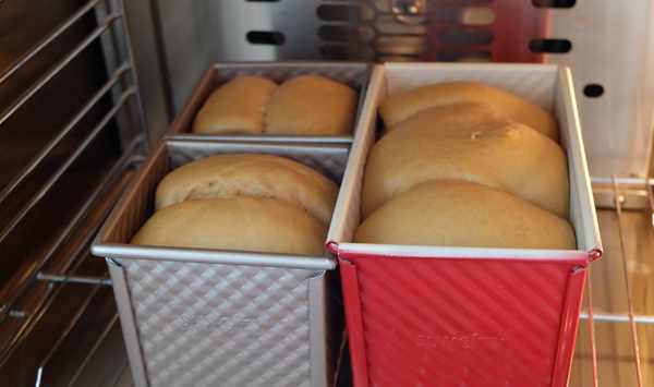 12、烤箱預熱165度,將發酵好的面包盒放進烤箱裡,165度烘烤40分鐘。不同烤箱的溫度設置是不一樣的,請根據自傢烤箱的脾性進行調整。