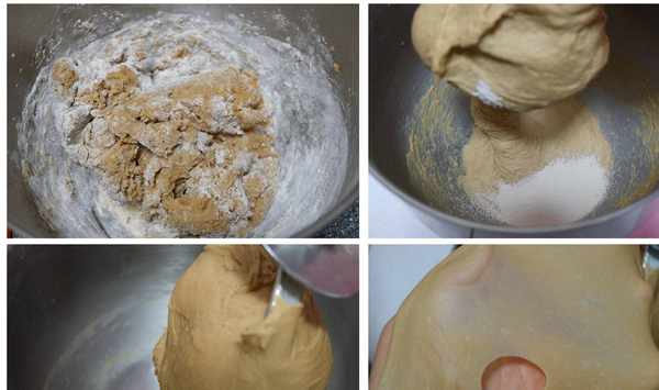 4、先用筷子將攪拌盆裡的食材攪拌均勻,安裝到廚師機上,2檔攪拌至表面光滑,再倒入耐高糖酵母粉;