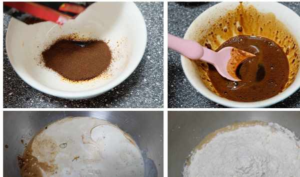 3、將黑咖啡液、牛奶、淡奶油、雞蛋、鹽、糖都倒入攪拌盆裡,再倒入高筋面粉;