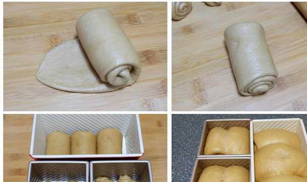 11、將卷好的面卷分別放進吐司模具裡。四個小面卷,分別放進兩個正方形吐司盒裡,另外三個面卷則需要放進長方形吐司盒裡;放到溫暖密封處進行二次醒發。