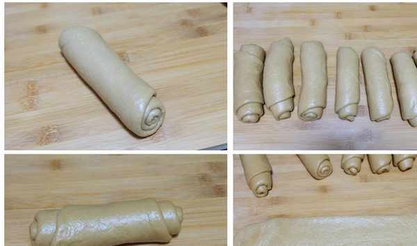 10、將收口處用搟面杖再壓薄一些,使面卷自然卷起,收口朝下,卷成一個漂亮的小面卷;