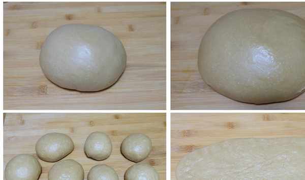 7、將醒發的面團切割分成兩份,再將其中一份分割成四個等大的小面團,另一份則分成三個等大的小面團,分別揉圓後,蓋上保鮮膜,放置醒發10分鐘;取一個面團,搟開後,再從一側卷起;