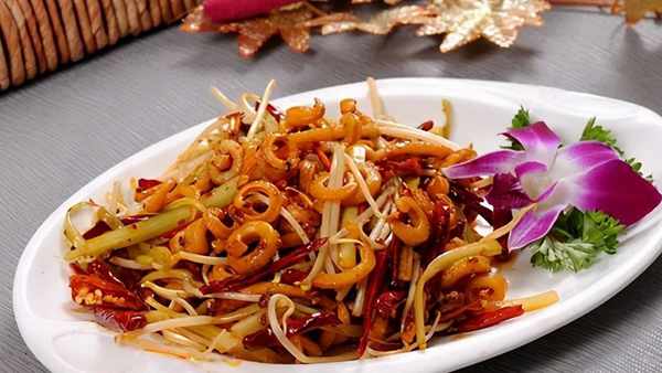 2.鍋置旺火上,放菜油燒至六成油溫,放魷魚絲煸炒一下,噴入料酒煸幹時,再加入鹽、醬油、白糖、料酒炒香,加豆芽,噴料酒,煸炒至芽菜斷生時,加入味精,淋上香油推勻,起鍋裝盤即成。