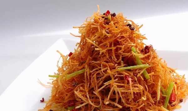 1.土豆絲洗凈之後,瀝幹水分,裹上少許幹淀粉拌勻,即可下到六成熱的油溫中炸至金黃,撈出備用。