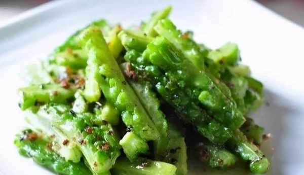 2.鍋下油,下蒜瓣,幹辣椒段炒香,下苦瓜炒透,調味精,鹽,再下點幹辣椒段炒勻出鍋即可。