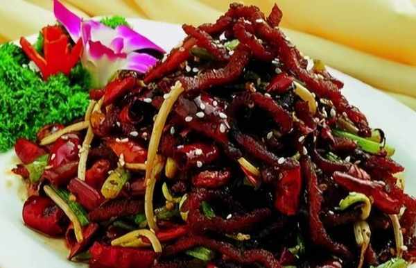 2.鍋置中火上,放熟菜油燒至五成熱時,放入幹辣椒絲炒成棕紅色撈起,再倒入肉絲,煸幹水汽,加上料酒、鹽、筍絲繼續煸炒至幹香時,加辣椒絲、味精、蔥絲炒勻,淋上香油,起鍋裝盤即成。