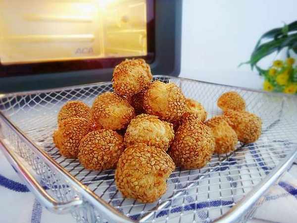 都做好的小球放入空氣炸箱的炸籃裡面,擺放好。炸箱一邊預熱180度,炸15分鐘即可。