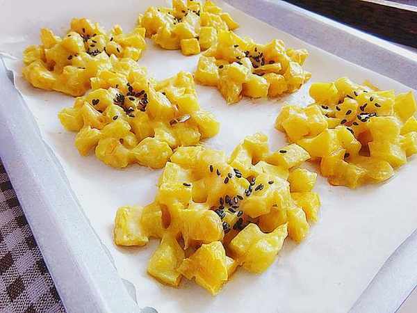 做法:地瓜去皮切約1厘米見方的小塊;放入面粉和攪散的雞蛋液拌勻;攪拌好的紅薯塊夾起來,會有點拉絲的樣子就可以。烤盤鋪上油紙,紅薯塊舀到上面,整理成圓餅狀;烤箱預熱上小火160度烘烤10分鐘,取出刷上一層蜂蜜水,撒點芝麻;再放回烤箱用上下火170度,紅烤10分鐘即可。