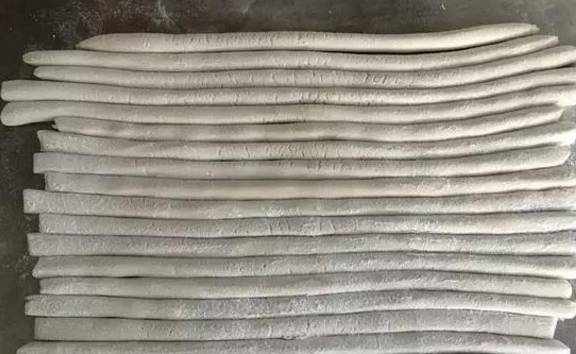 然後把面團搓成條狀,粗細比手指小一點細一點就行瞭,然後把搓好的條狀切成一小段一小段,差不多切5厘米左右就行,鍋裡的油燒熱後,把切好的面團輕輕的放進去(以防濺熱油)。
