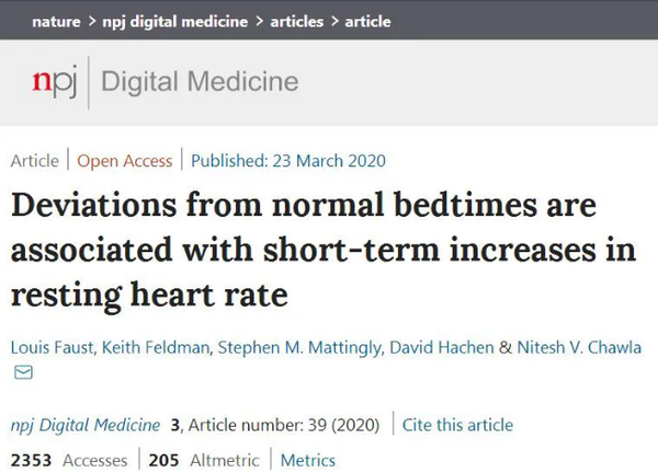 2020年,一項發表在全球權威學術期刊《自然》上的研究,再一次證實了晚睡的"新罪名":入睡時間的變化可干擾我們的心率,且這一影響會持續到第二天下午。而按時睡覺的人,靜息心率最低;越晚睡的人,靜息心率越高,而靜息心率過快與心血管疾病的發生有著非常緊密的關係。