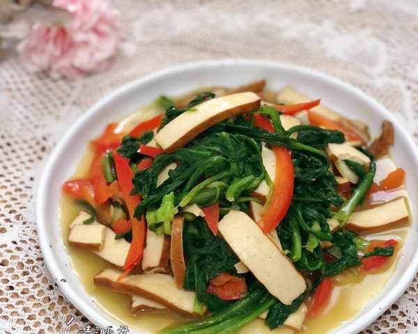 茼蒿也叫蓬蒿,它富含葉酸、各種維生素和礦物質,可以滋養脾胃,增進食欲、助消化,在古時還被稱作“皇帝菜”,鮮嫩的茼蒿散發著清氣感,搭配熏幹炒一炒,也很開胃。〖用料〗:茼蒿、熏幹、彩椒、大蒜、鹽、香油適量