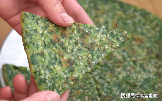 底面定型以後,利用一個盤子拖起底部翻面,繼續烙三分鐘,烙至兩面金黃出鍋。切成小塊方便食用,茼蒿雞蛋餅就做好瞭。