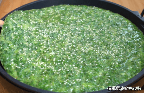 電餅鐺開小火預熱,在底部刷一層油,把菜糊倒進來。撒一些白芝麻,選擇大火,先烙三分鐘。