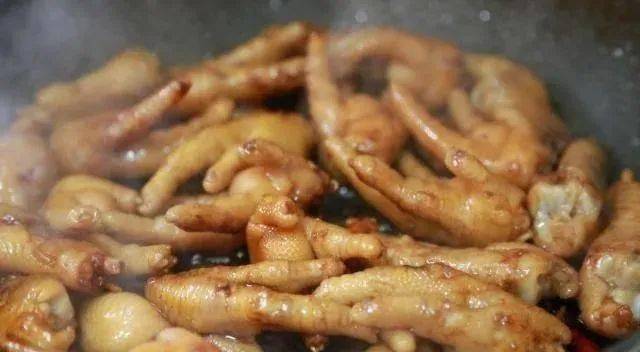 5、加入雞爪翻炒,使雞爪均勻裹上糖色;