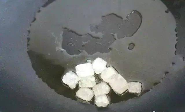 4、起鍋燒油,加入冰糖小火翻炒至融化,炒出糖色;
