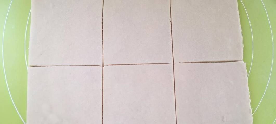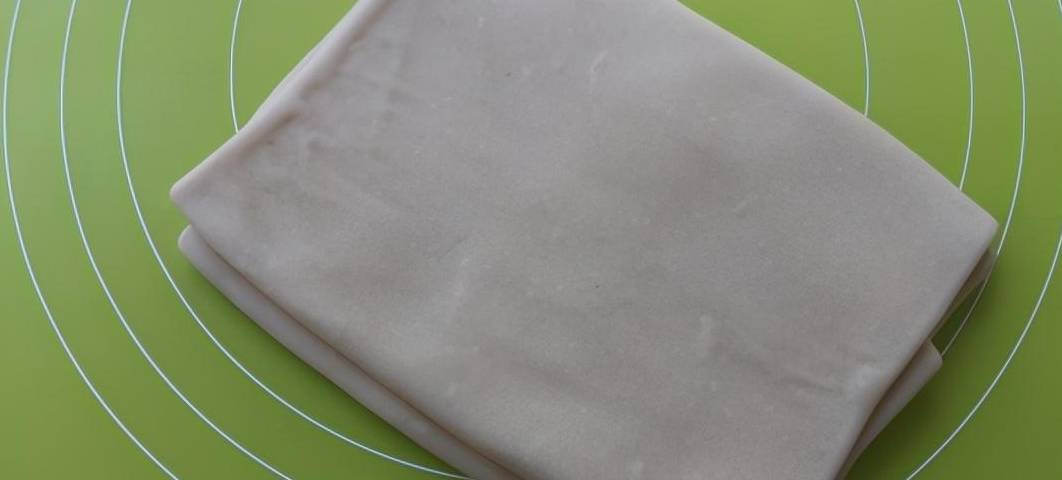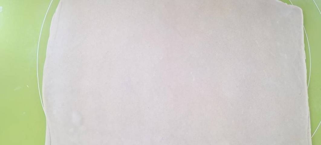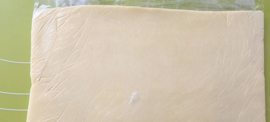 16.撒點幹粉,將冷藏好的面片搟成長方形,厚度約為0.3厘米左右