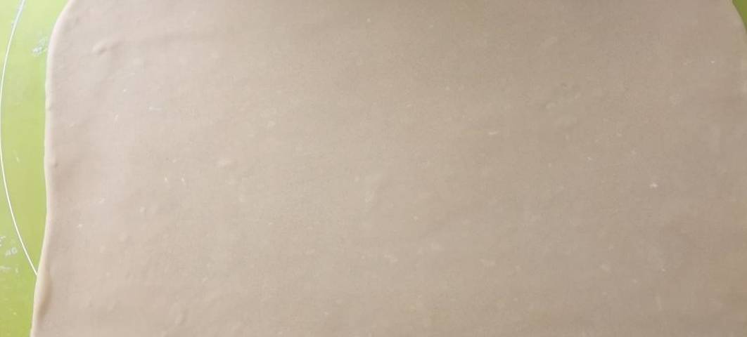 11.揉面墊上撒點幹粉,將面片輕輕搟成長條,長度為揉面墊的長度
