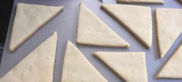 21.將裁好的小三角移到烤盤內,裁掉的邊角可以扭成麻花,蓋保鮮膜室溫二次發酵,我的室溫25度,發酵瞭一個小時,傢裡溫度高的,建議放到涼快點的地方發酵