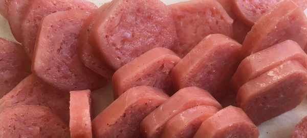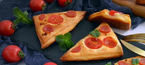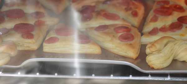 25.將香腸跟聖女果平鋪在發酵好的三角包上,具體分量可以根據自己喜好來放