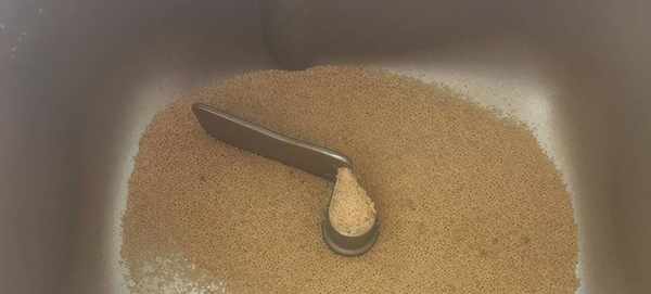 1.黃糖粉容易結塊,先過篩15克顆粒比較小的到面包桶內