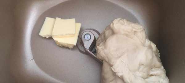 3.加入軟化的黃油,繼續啟動揉面程序,將黃油跟面團揉均勻