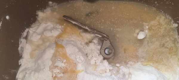 2.之後加入高筋面粉,低筋面粉,全蛋液,奶粉,酵母,加水啟動揉面程序,將面粉和成面團