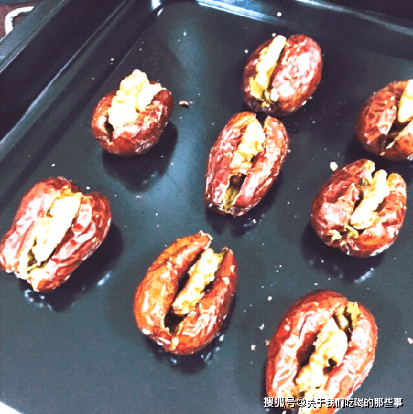 2、把烤熟的核桃仁塞入紅棗中,用手捏緊,放在烤盤上。烤箱150℃,再烤8分鐘,取出後放涼,即可食用,又香又酥,特別好吃。
