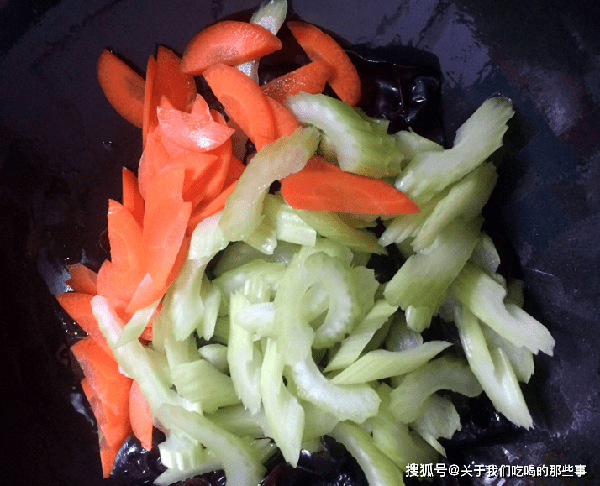 3、鍋裡倒油燒熱,倒入黑木耳大火翻炒一會兒,再放入西芹、胡蘿卜,繼續翻炒一會兒,熟透後加入食鹽、生抽、雞精調味,放入熟核桃仁翻炒均勻,即可出鍋。