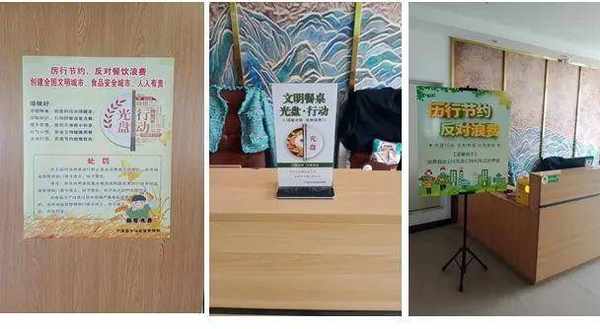 在大廳張貼制止餐飲浪費宣傳海報,餐桌上設有光盤行動及節約用餐的提示。