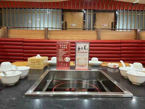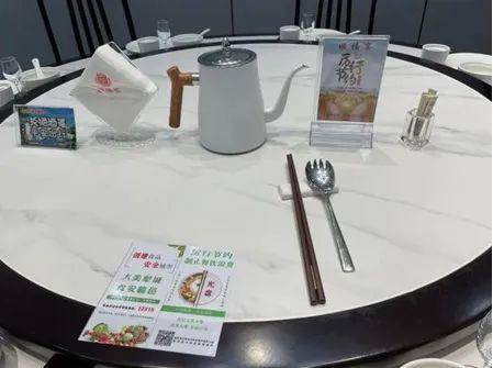 餐桌上擺放“光盤行動”提示牌,提醒顧客節約用餐、擺放“公筷公勺”、提供打包服務