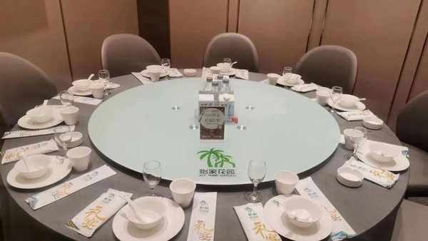 在餐桌規范擺放“節約糧食、文明用餐”桌牌。