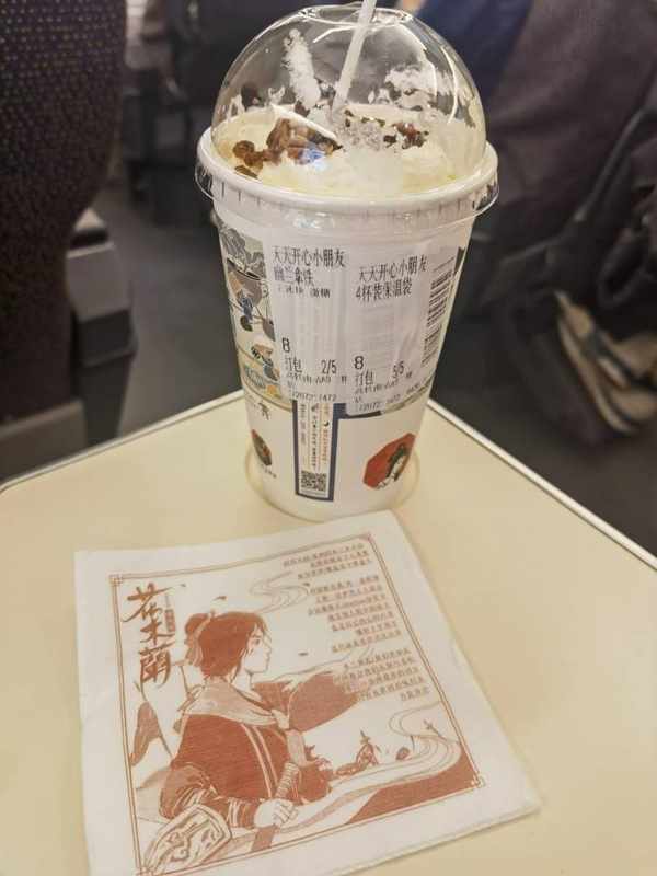 這次去佛山,沒啥經驗,由於涉及到換乘,怕航班耽誤,所以選擇瞭從杭州東站坐高鐵到廣州南站。發現該班次還路過長沙南站,這不就在某二手app上,看有沒有茶顏悅色的代購,沒想到人生的第一杯茶顏悅色就在高鐵上喝到瞭。
