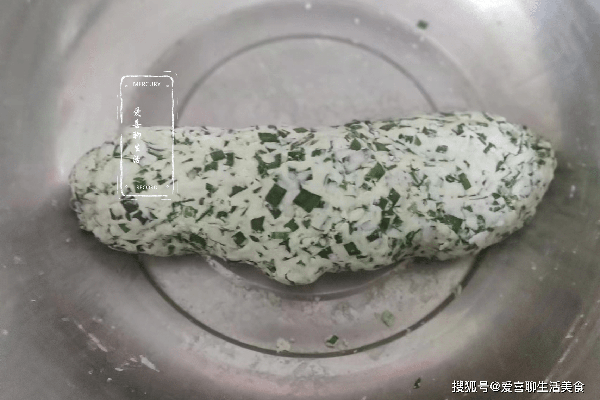 第二步,揉成粉團。接著,把韭菜碎放入大盆中,加入一斤糯米粉拌勻,然後再少量多次加入溫水,攪拌至沒有幹米飯,下手揉成一個光滑的粉團。