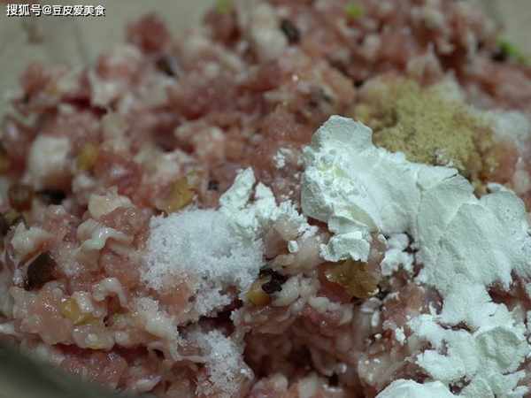 2、把肉餡倒入盆裡,加入適量的鹽,胡椒粉,淀粉,生抽,蠔油,充分攪拌均勻。餡料就做好瞭。