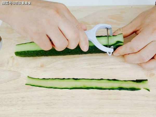 2、把黃瓜平放,右手拿削皮刀,從左邊開始,一路刮到右邊,刮下長長的一條黃瓜薄片,盡量不要斷掉。