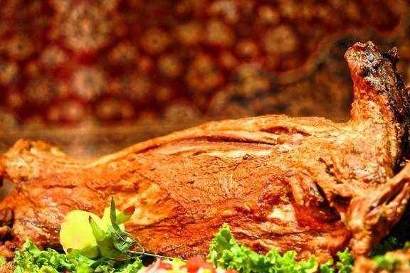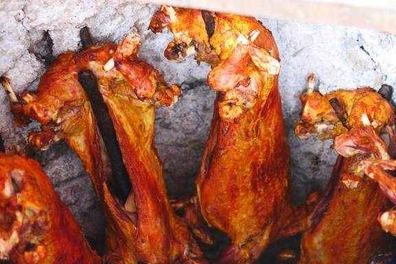 由於醃料裡面是放瞭鹽的,根據不同人的口味兒,在食用時,房主人把肉切成小塊,客人隻需要根據自己的口味,將肉塊沾上一點鹽,香味更加濃鬱。這就是最早的馕坑肉瞭,也被稱為烤全羊。