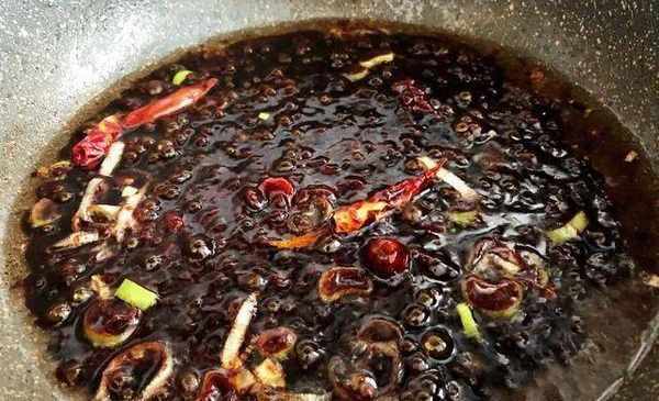 4.另起一鍋,大火燒熱後加入少許食用油,待到油溫升至四層左右,放入冰糖熬化,然後加入準備好的豆瓣醬、八角、桂皮和幹辣椒,最後倒入適量的蠔油和老抽調成醬汁;