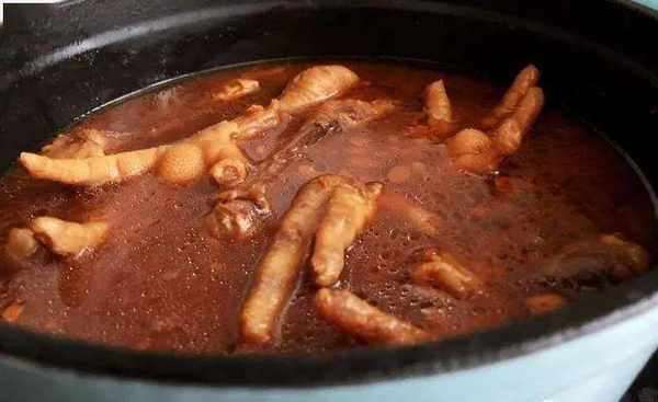 5.倒入炸好的雞爪翻炒一下,使其表面能均勻地裹上一層醬汁,最後倒入足量的清水,加入準備的腐乳和一丟丟米醋,大火燒開後,蓋上蓋子煮四十分鐘,待到鍋中雞爪完全軟爛後,加入少許食鹽,繼續煮十分鐘,即可關火出鍋;