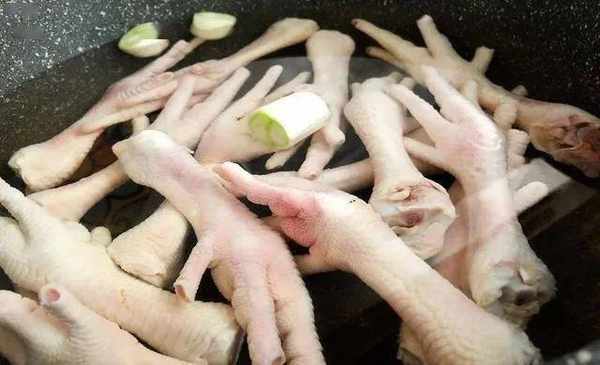 2.雞爪倒入空碗中,倒入足量的清水和少許料酒,加入切好的蔥段和薑片,大火燒開後,用雞爪不停翻動,待到其完全變色後,撈出用冷水迅速沖洗冷卻,瀝幹水分備用;