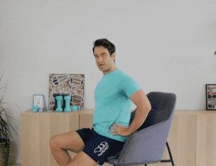 ■坐在椅子1/2處,單側腿屈膝,另一側腿伸直,同時腳尖回勾,腳跟著地