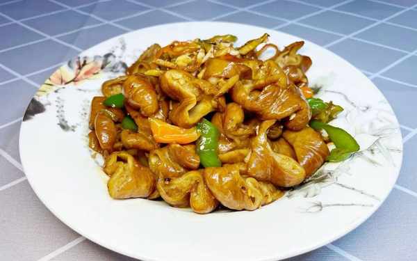 6 放入大腸一起煸炒出油,大腸微微發黃的時候,倒掉多餘的油。