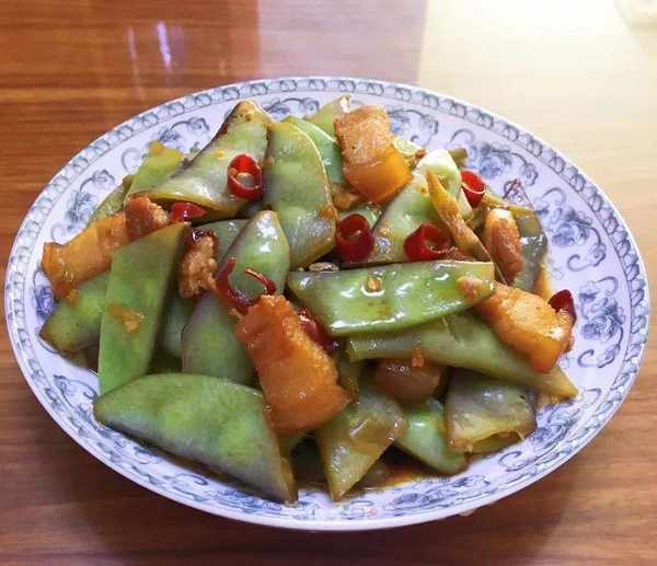 洗凈扁豆適量、凈肉皮適量、宴友食用油適量、蔥適量、薑適量、料酒適量、醬油適量、鹽適量、味精適量