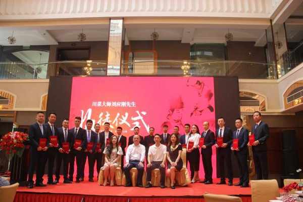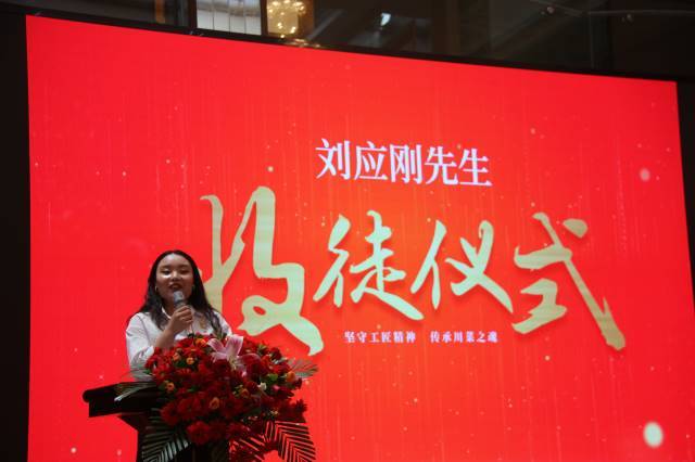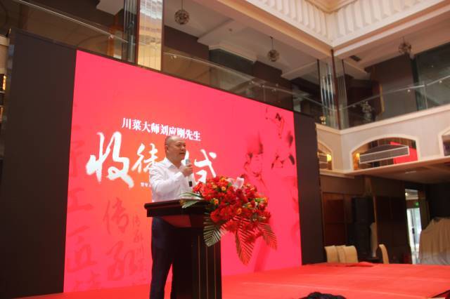 成都印木餐飲管理有限公司、印木餐飲(集團)、四川鮑鮮森商貿有限公司、成都越善酒店管理有限公司董事長劉應剛先生首先在收徒儀式致歡迎辭:“首先各感謝大傢遠道而來,共同見證我的收徒儀式,我師從陳貴賓先生,師父從美國回來,見證我的收徒儀式,見證劉傢班隊伍越來越壯大,我榮幸至極尊師重道、薪火相傳。師父教會我很多道理,嚴於律己、寬已待人。我希望我師門所有成員都能謹記這句話,都能做到以下幾點:對師傅尊師重道,對徒弟執教傳藝,對廚藝精益求精,同時也要不斷創新,不斷提升自己,為師門增光添彩!再次感謝大傢。”