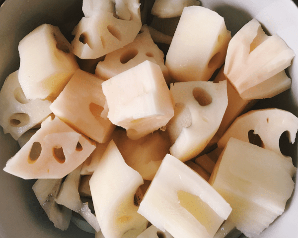 然後蓮藕洗凈,用小刀削去表皮,就可以切成大小適宜的塊狀,放入鍋中備用。