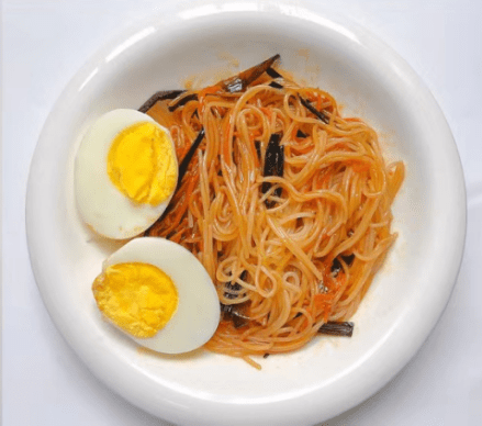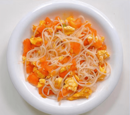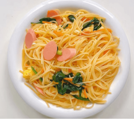 做法:鍋中熱油倒入蔥段翻炒、倒入胡蘿卜絲翻炒變軟,加入醬汁:番茄醬、醬油、水、加入提前煮好的面條攪拌均勻