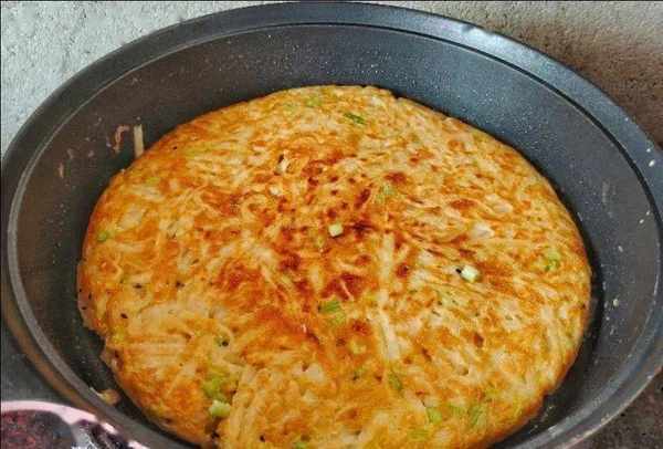 6、蓋上一個大的盤子,把鍋倒扣過來,再把鍋裡來上少許油,把面餅翻一個面重新倒回鍋,這樣翻面不會把面餅給弄碎,直到煎至兩面金黃就可以出鍋瞭