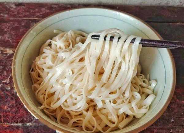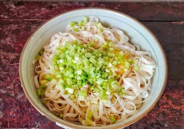 1、我們把準備好的剩面條放入碗中,這個是昨天晚上做涼面,剩下來的一小碗,今天從冰箱拿出來,一點都沒有黏連,而且還一樣的勁道。如果沒有剩下的面條,可以直接水煮一點。