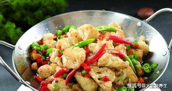 7、加入紅辣椒塊和菜花,翻炒幾下;